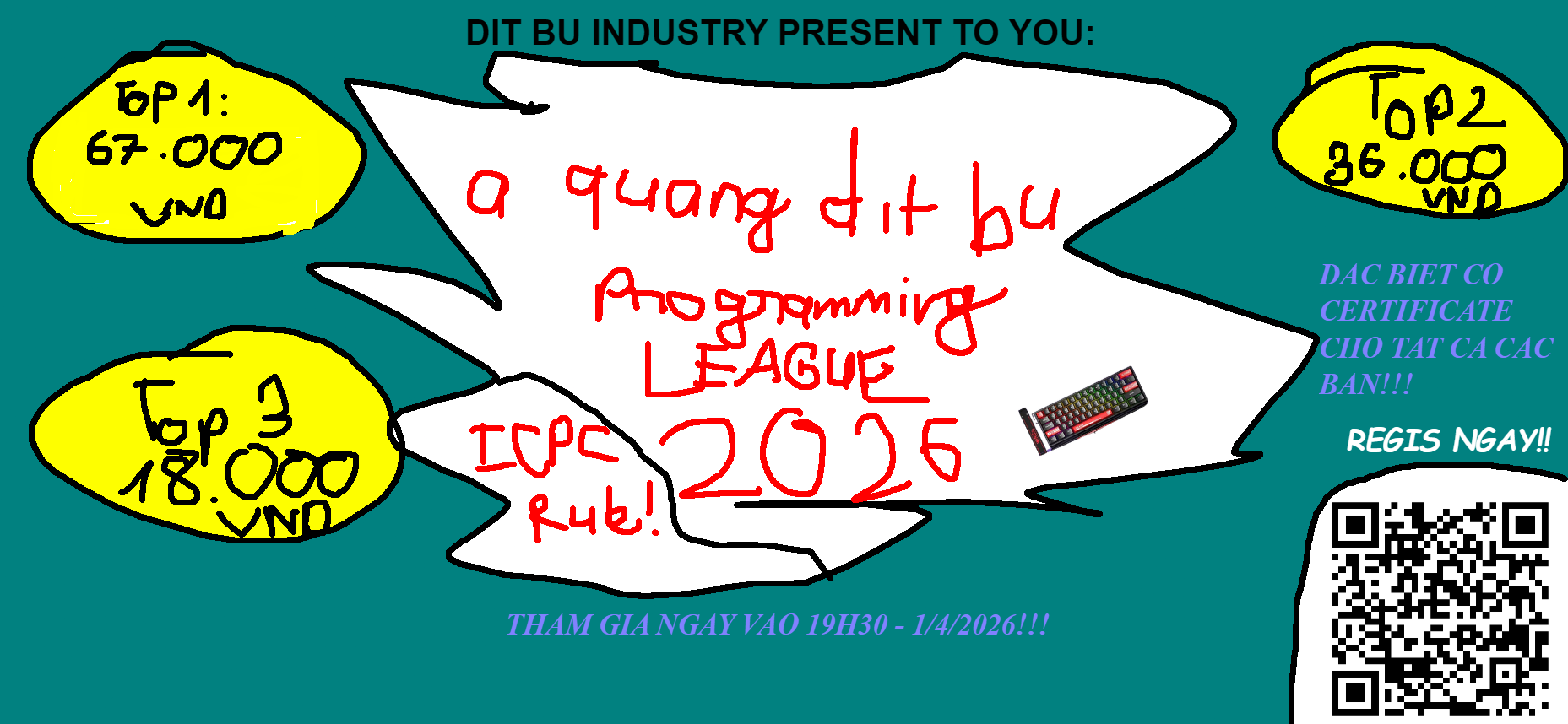 btw, vào ngày 1/4/2026, 19h30, chúng mình sẽ host contest đánh giá năng lực ICPC dưới cái tên a quang dit bu programming league 2026!!!!!